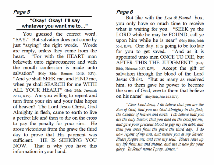 But like with the Lost & Found box, you only have so much time to receive what is waiting for you. “SEEK ye the LORD while he may be FOUND, call ye upon him while he is near” (Holy Bible, Isaiah 55:6, KJV). One day, it is going to be too late for you to get saved. “And as it is appointed unto men ONCE TO DIE, but AFTER THIS THE JUDGMENT” (Holy Bible, Hebrews 9:27, KJV). Accept the gift of salvation through the blood of the Lord Jesus Christ. “But as many as received him, to them gave he power to become the sons of God, even to them that believe on his name” (Holy Bible, John 1:12, KJV).