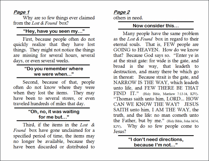 Many people have the same problem as the Lost & Found box in regard to their eternal souls. That is, FEW people are GOING to HEAVEN. How do we know that? Because God says so. “Enter ye in at the strait gate: for wide is the gate, and broad is the way, that leadeth to destruction, and many there be which go in thereat: Because strait is the gate, and NARROW IS THE WAY, which leadeth unto life, and FEW THERE BE THAT FIND IT.” (Holy Bible, Matthew 7:13-14, KJV). “Thomas saith unto him, LORD... HOW CAN WE KNOW THE WAY? JESUS SAITH unto him, I AM THE WAY, the truth, and the life: no man cometh unto the Father, but by me.” (Holy Bible, John 14:5-6, KJV). Why do so few people come to Jesus?