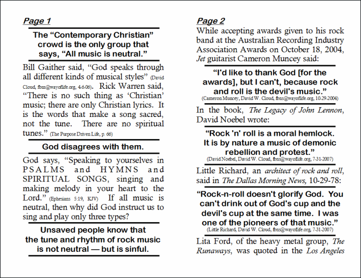 Bill Gaither said, “God speaks through all different kinds of musical styles” (David Cloud, fbns@wayoflife.org, 4-6-06). Rick Warren said, “There is no such thing as ‘Christian’ music; there are only Christian lyrics. It is the words that make a song sacred, not the tune. There are no spiritual tunes.” (The Purpose Driven Life, p. 66)